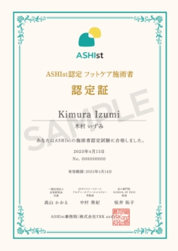 ASHIstでは、皮膚科医で一般社団法人足育研究会代表の高山かおる先生による総監修、JPポドロジースクール 中村美紀学院長・足の専門校 SCHOOL OF PEDI 桜井祐子校長の監修で、フットケアの施術者認定プログラム・認定試験をご用意しています。