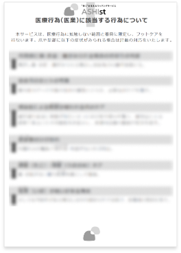 ASHIstで提供するフットケアには医療行為(医業)に該当する内容は含まず、施術内容は、施術者認定プログラムの中で定義されています。専門家監修のもと、ASHIstにおけるフットケアの基準を定め、これに準じて施術を行ないます。リスクがある利用者への施術を回避するノウハウ・ツールを体系化し、安心・安全な施術が行えるよう留意しています。